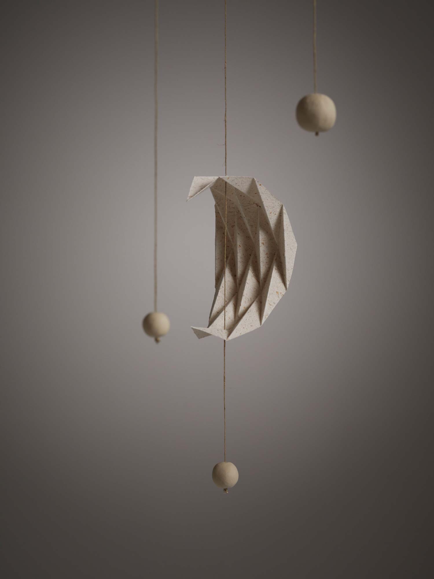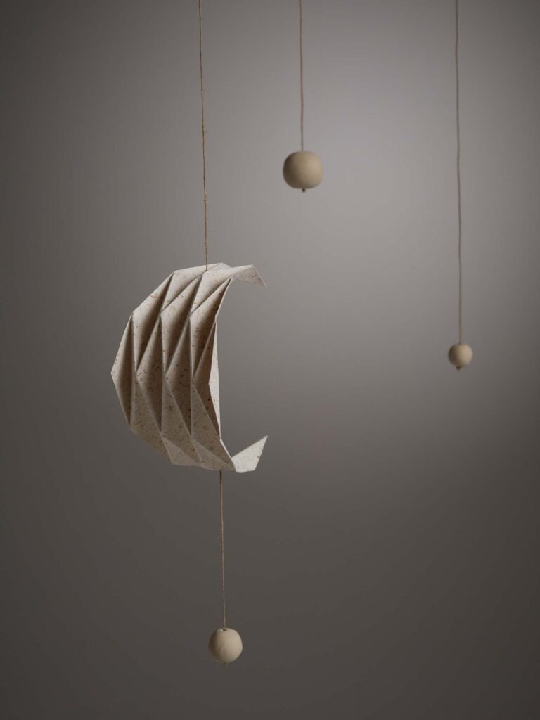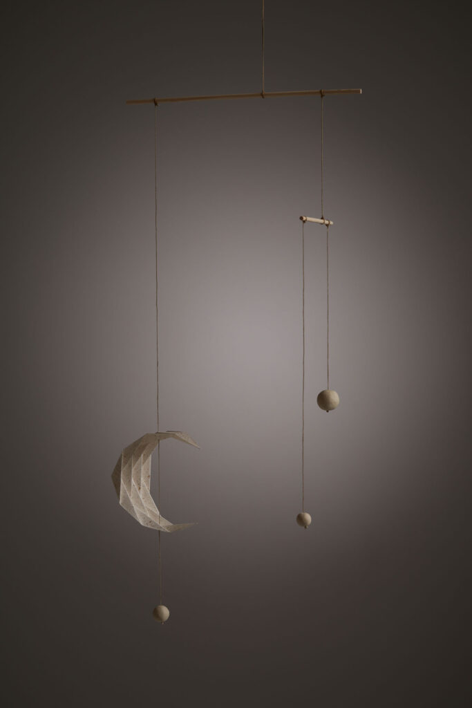 SIDERAL es un móvil elaborado 100% a mano en el que hemos empleado materiales naturales y artesanales procedentes del pequeño comercio local: papel, cerámica, madera y fibras naturales.